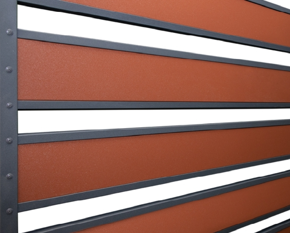 Формой напоминает забор из массивных строганных досок. Представлена технология Double Pro® - ограждение смотрится одинаково эстетично с обеих сторон.